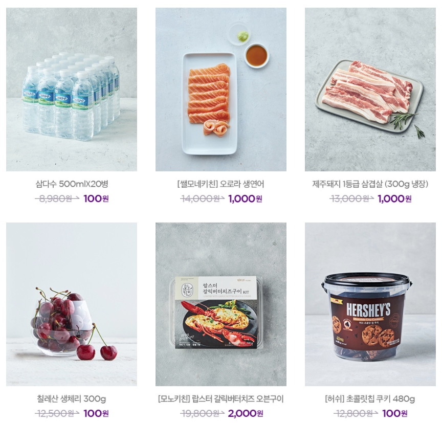 다음은 현재 마켓컬리 100원 이벤트로 구매할 수 있는 상품 목록이다.