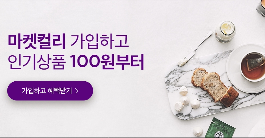 마켓컬리 신규가입을 하면 인기상품을 100원에 구매할 수 있는 이벤트가 상시 진행된다.