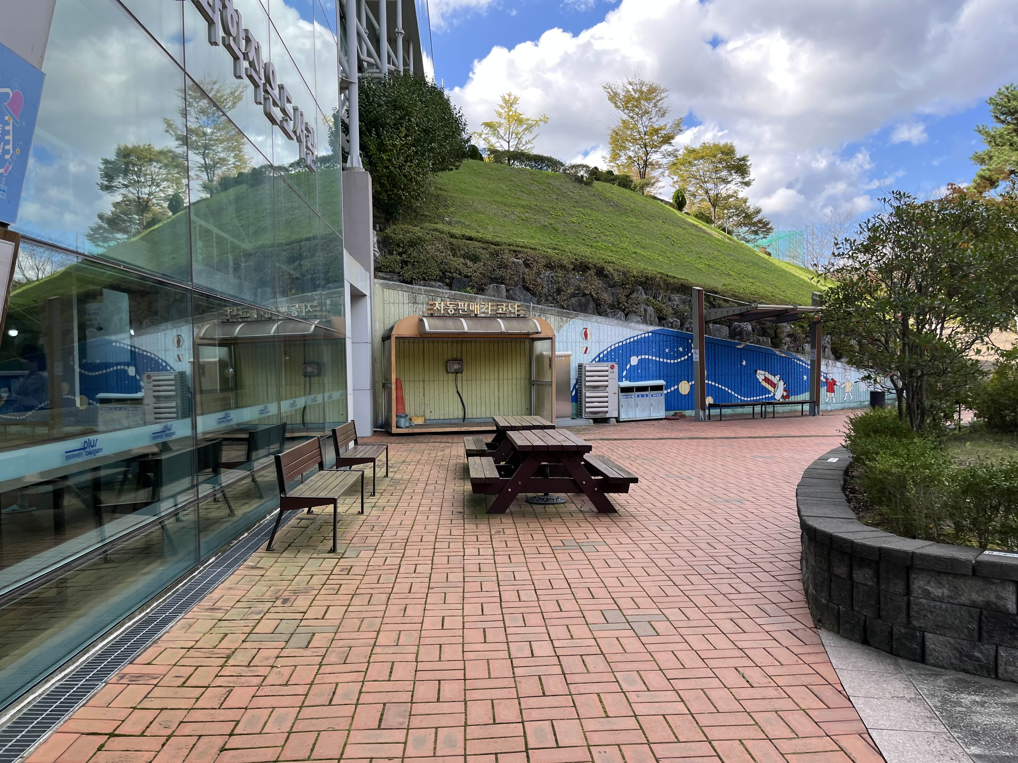 과학관 3층 바깥으로 나가면 그늘막 쳐져서 돗자리 깔기 좋은 야외존이 있다.